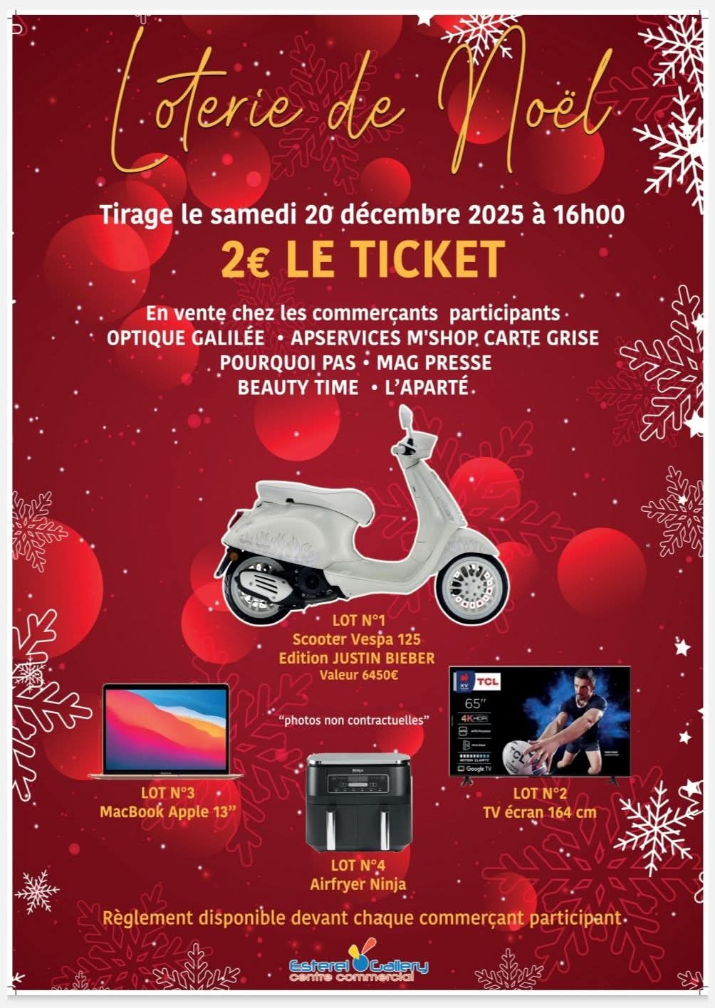 - Tickets (€2) are available at participating retailers: Optique Galilée, Apservices M'Shop Carte Grise, Pourquoi Pas, Mag Presse, Beauty Time, l'Aparté. The Christmas lottery draw will take place on Saturday, December 20th at 16 PM.
